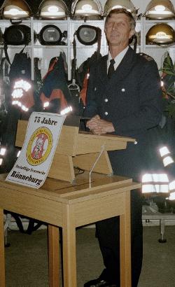 Es folgten persönliche Glückwünsche an die Wehr durch den Landesbereichsführer Hermann Jonas, den Direktionsbereichsführer Süd Bruno Jansa und den Bereichsführer Harburg Burkhard Neumann. Seitens der Berufsfeuerwehr wurden Grüße durch den Branddirektor A. Kattke und den Wachleiter Vertreter der FuRW 31 überbracht. Auch unsere niedersächsische Nachbarwehr, die FF Moor war vertreten durch ihren Ortsbrandmeister K. Heitmann. In allen Reden wurde besonders die hohe Motivation und gute Kameradschaft der FF Rönneburg gelobt, die uns zu einem starken Team macht. Da wir ein sehr gutes Verhältnis zu unserer zuständigen Polizeiwache, dem Polizeikommissariat 45 pflegen, durfte natürlich auch deren Leiter, der 1. Polizeihauptkommissar W. Dreher und unsere bürgernahe Beamtin Polizeioberkommissarin C. Lanfer nicht fehlen.