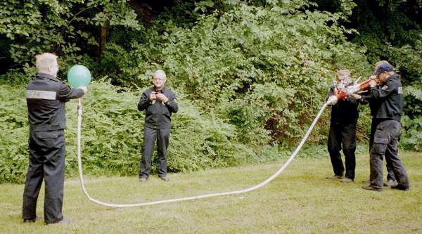 Hier sollte der Bevölkerung die Möglichkeit gegeben werden, sich über die Arbeit der Feuerwehr zu informieren, oder auch nur einen schönen Nachmittag zu verbringen. Die Jugendfeuerwehr Sinstorf zeigte in einer Übung ihr feuerwehrtechnisches Können, während die aktiven Mitglieder der Wehren aus dem Bereich Harburg und der FF Moor in einer Spaßübung eher Aufgaben erledigen mussten, die man nicht an der Feuerwehrschule lernt. So musste zum Beispiel mit einer Schlauchleitung und verschiedenen Armaturen ein Luftballon zum platzen gebracht werden. In einer anderen Disziplin mussten gefüllte Wassereimer möglichst verlustfrei den Burgberg hochtransportiert und das Wasser per Schlauchleitung am Fuß des Berges wieder aufgefangen werden. Letztendlich wurde noch das Gedächtnis der Gruppenführer in einer Art Feuerwehrmemory getestet.