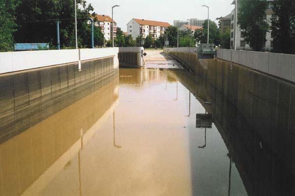 Durch das Hochwasser der Weißeritz, das den gesamten Bahnhofsbereich überflutet hatte, war eine Unterführung unter der Sankt Petersburger Straße auf ca. 400 m Länge bis unter die Tunneldecke vollgelaufen. Damit beim Leerpumpen der Unterführung keine Bauschäden durch das sehr hoch stehende Grundwasser entstehen konnten, bestand unsere Aufgabe darin, den Grundwasserspiegel in diesem Bereich zu senken. In der Umgebung der Unterführung ist ein Drainagesystem installiert, welches aus mehreren Sammelschächten besteht, die untereinander durch Rohrleitungen verbunden sind. Diese Rohrleitungen können in jedem Schacht durch Absperrschieber verschlossen werden. Um großflächig das Grundwasser abpumpen zu können, haben wir sämtliche Schächte geöffnet und die Schieber aufgedreht. Mit der Fahrzeugpumpe des LF Osdorf wurde dann das Grundwasser in die Kanalisation befördert.