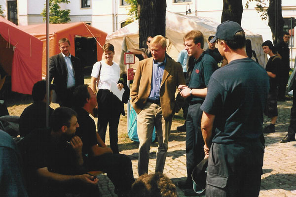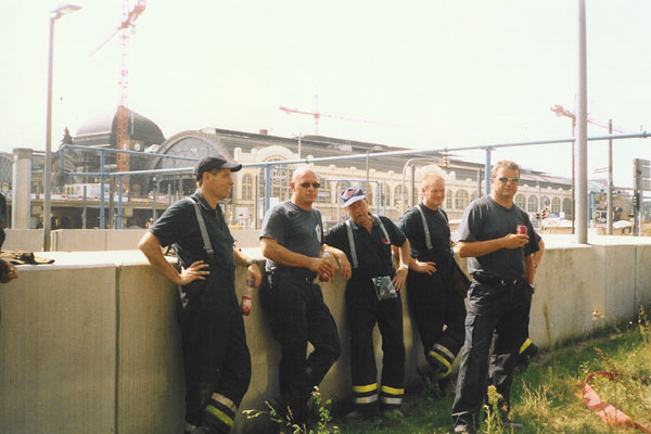 Am Donnerstag, dem 22.08.02, machten wir uns (Volker Hampe, Peter Plum, Herwart Wiederhold, Florian Bornmüller und Andreas Wilkens) zusammen mit ca. 40 weiteren Kameraden aus FF und BF auf den Weg zur Ablösung nach Dresden. Wir fuhren um 5.00 Uhr morgens vom Berliner Tor ab und erreichten gegen 11.00 Uhr unsere Unterkunft in der Heeresoffiziersschule Albertstadtkaserne. Nach der Begrüßung und Bekanntgabe der Fahrzeugeinteilung bezogen wir unser Quartier in den kuscheligen Feuerwehrzelten, erkundeten beim Mittagessen die Kantine und begaben uns dann auf die Fahrzeuge.
