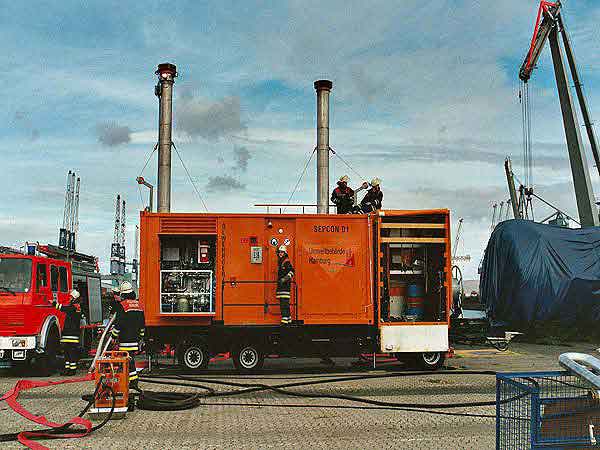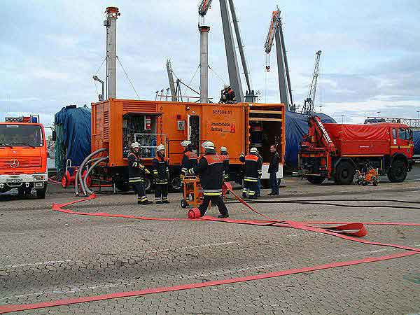Diese Schadenslage musste von uns in Zusammenarbeit mit anderen Kräften abgearbeitet werden. Beim Eintreffen waren bereits Kräfte der Feuerwehr Bremen damit beschäftigt Ölschlängel im Hafenbecken zu verlegen. Kräfte vom THW Cuxhaven waren damit beschäftigt Ihre Ölauffanggeräte (Skimmer) in Betrieb zu nehmen.