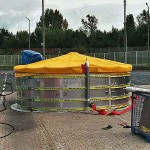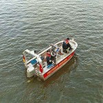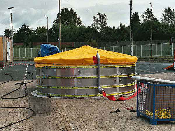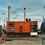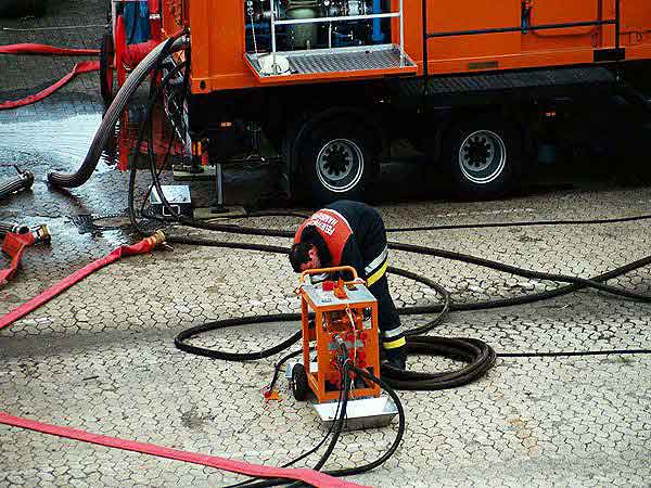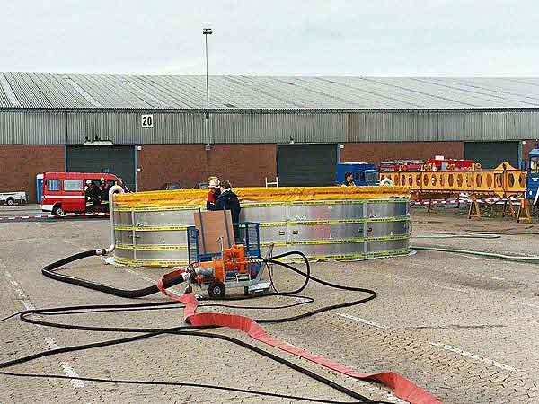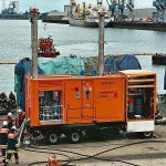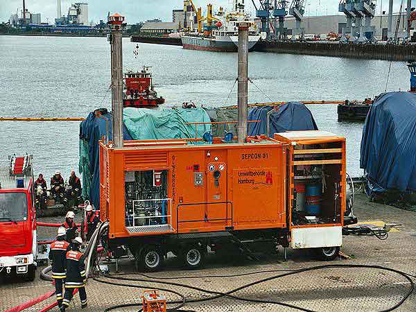 Wir fingen also ebenfalls an unsere Öl-Separationsanlage (SEPCON) betriebsfertig zu machen, was uns auch schnell gelang. Während des Aufbaus ergab sich das Problem, das die Skimmer von THW, die unsere Anlage mit dem ölverschmutzten Wasser befüllen bzw. versorgen sollten, komplett Ihren Dienst versagten. Wir mussten uns nun kurzfristig überlegen, wie wir unsere Anlage selber mit dem ölverschmutzten Wasser zum Übungszweck versorgt bekamen. Als einzige Möglichkeit ergab sich der Betrieb einer Turbinentauchpumpe, was schnell umgesetzt war und auch funktionierte.
