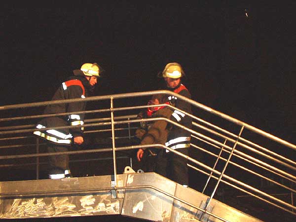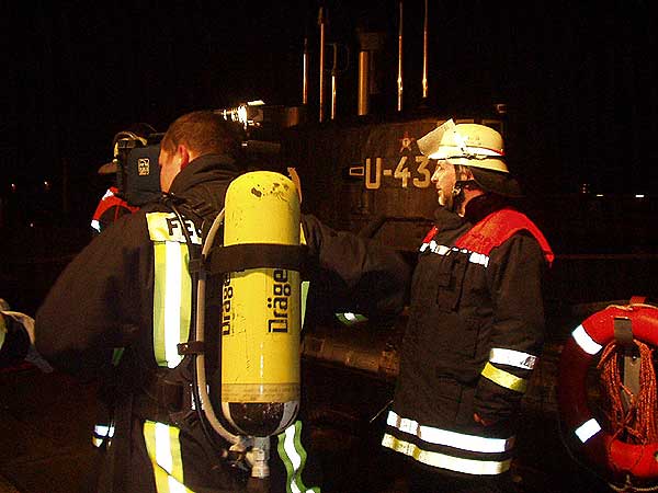Nach kurzer Erkundung und Befragung des Betreibers war schnell klar, dass im U-Boot ein Feuer ausgebrochen war und dass sich darin noch mindestens vier Personen befinden mussten. In getrennter Einsatzformation wurde ein kombinierter Löschangriff mit Menschenrettung über die vordere und achtere Zugangsluke des U-Bootes vorgenommen. Jeweils zwei PA-Trupps pro Seite arbeiteten sich unter Vornahme eines C-Rohres zur Brandbekämpfung und Menschenrettung in das U-Boot vor. Trotz der großen Enge im Boot und der völlig unbekannten Übungssituation (wann bekommt man schon einmal ein U-Boot zum Üben) konnten innerhalb von 10 Minuten vier verletzte Personen gerettet werden.