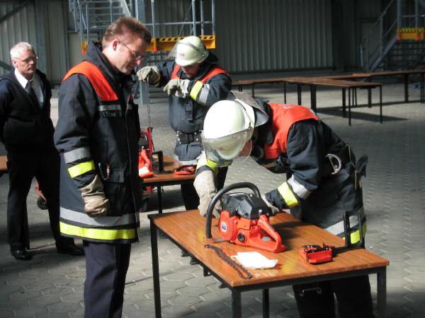 Geprüft wurden u.a. theoretische Kenntnisse, das Warten der Motorkettensäge, die Behandlung einer bewusstlosen Person und das Instellungbringen einer 3-teiligen Schiebleiter mit Leitersteigen und Einbinden von verschiedenen Gerätschaften (Axt, Notfallkoffer, Feuerlöscher usw.).