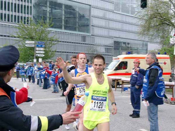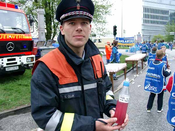 Im Feuerwehrhaus deponierte er eine Getränkeflasche mit einem Elektrolytgetränk , welches ihm bei Laufkilometer 15,0 am Deichtorplatz bereitgehalten wurde.