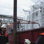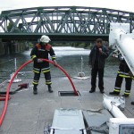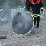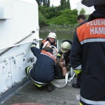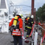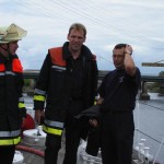 Die Trupps wurden zwischen den beiden Wehren gemischt, so war ein besseres Zusammenarbeiten und Kennenlernen möglich.Die Rettung der Personen gestaltete sich im verqualmten Schiffsbauch ziemlich schwierig. Die Aufgabe wurde aber von den Trupps schnell und ohne größere Probleme erledigt. Die Wasserversorgung aus offenem Gewässer wurde zügig aufgebaut und wir hatten schnell Wasser an der Einsatzstelle.