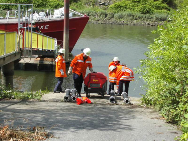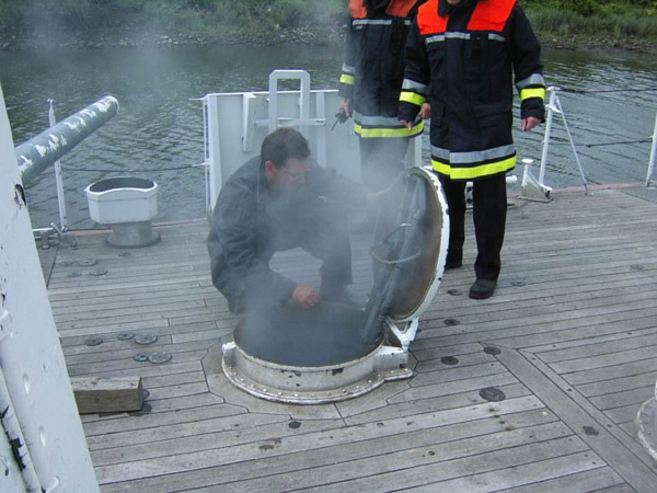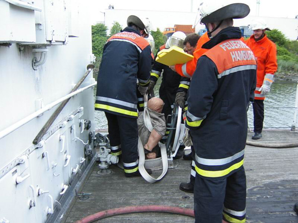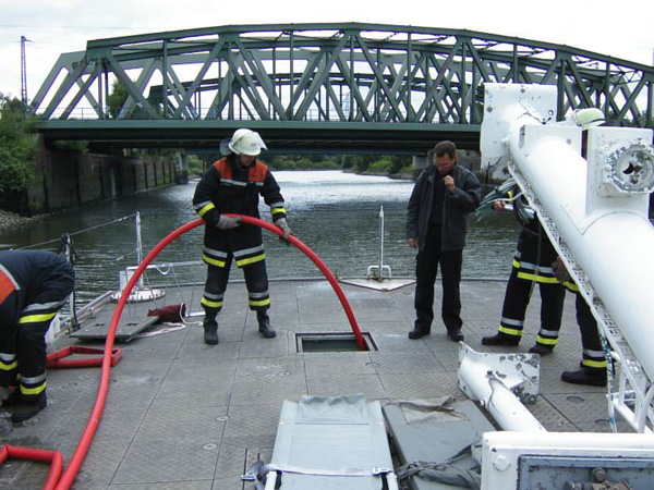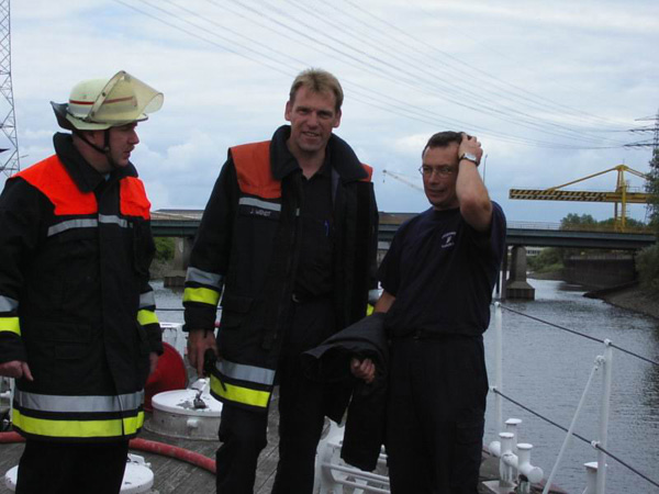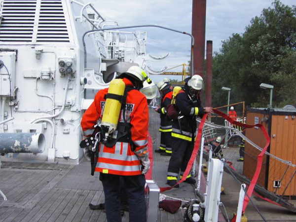 Die Trupps wurden zwischen den beiden Wehren gemischt, so war ein besseres Zusammenarbeiten und Kennenlernen möglich.Die Rettung der Personen gestaltete sich im verqualmten Schiffsbauch ziemlich schwierig. Die Aufgabe wurde aber von den Trupps schnell und ohne größere Probleme erledigt. Die Wasserversorgung aus offenem Gewässer wurde zügig aufgebaut und wir hatten schnell Wasser an der Einsatzstelle.