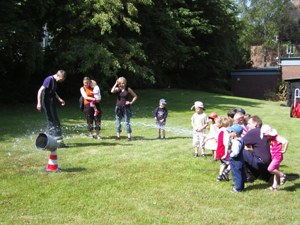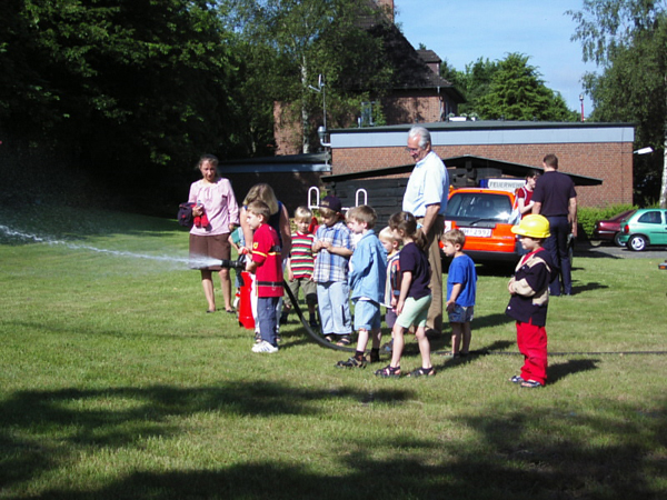 Neben einer kleinen Schulung (was man bei einem Notruf beachten muß u.ä.) wurde das Löschen geübt, die Nomexanzüge ausprobiert, die beiden Fahrzeuge der FF inspiziert und der ELW des Bereichsführers H.P.Langeloh angeschaut.