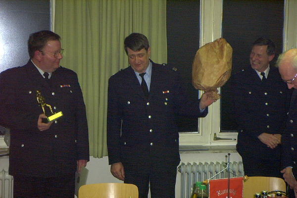 Direktionsbereichsführer West Walter Abendroth, zugleich Wahlleiter, gratulierte dem neuen Bereichsführer zu seiner Wahl und wünschte eine glückliche Hand in diesen für die Freiwilligen Feuerwehren doch manchmal schwierigen Zeiten. Dem ehemaligen Bereichsführer dankte er für die geleistete Arbeit. Dieser erhielt aus dem Kreise der Wehrführer-Kameraden und der Bereichsausbilder Präsente, hatte er doch lange Jahre der Jugendfeuerwehrarbeit und der Bereichsausbildung offen gegenübergestanden und länger als nur eine Amtszeit als Bereichsführer den Bereich geleitet. Anschließend lud der ehem. Bereichsführer, der weiterhin Feuerwehrdienst in seiner ursprünglichen Wehr FF Osdorf leisten wird, alle Anwesenden zu einem zünftigen Bratenessen ein.