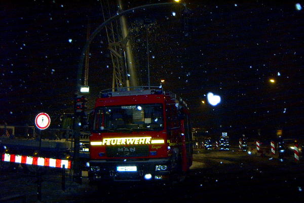 Nichtsdestotrotz ermöglichten die Wehren Altona, Ottensen-Bahrenfeld und Rissen unter Leitung des neuen Bereichsführers U. Prehm und des B-Dienstes West (Hr. Maaß) ihre Aufgabe. Zeitgerecht wurde der Kran, dessen Gesamtverband aus einem Aufbaukran (57 to.), dem eigentlichen Kran (800 to.) und drei Aufliegern mit Auslegern und Kontergewichten sowie einem Begleitfahrzeug bestand, unter Flutlicht aufgebaut, was bis etwa 7 h erledigt war.