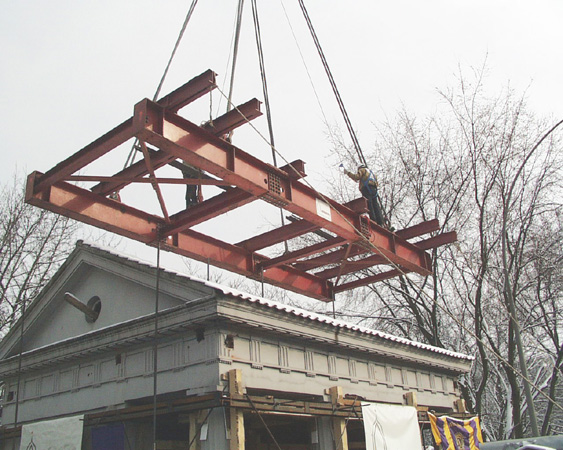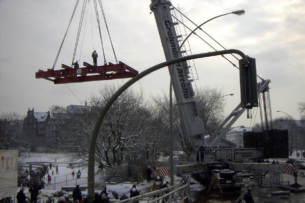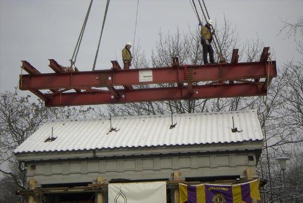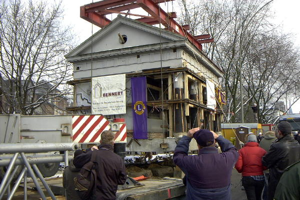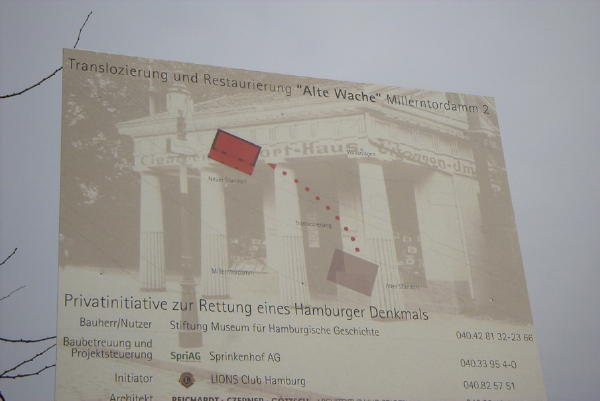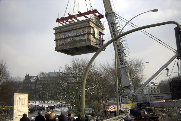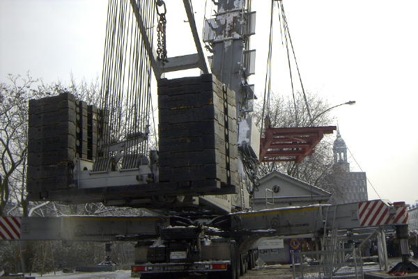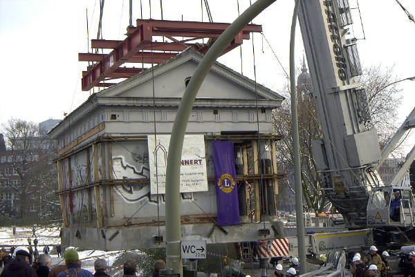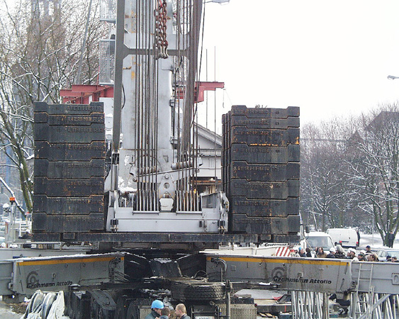 Ab 11 h war die FF Altona erneut vor Ort, um die Gebäudeumsetzung zu begleiten. Mittlerweile war bekannt, dass das Gebäude selbst 127 to. wog und die Traverse zum Heben noch einmal 56 to., zusammen waren also 183 to. zu bewegen. Allein die Gegengewichte des Krans wogen gut 160 to.. Nach einiger Vorbereitungzeit konnte um 13.13 h mit der Umsetzung begonnen werden, die gegen 14.30 h abgeschlossen war.