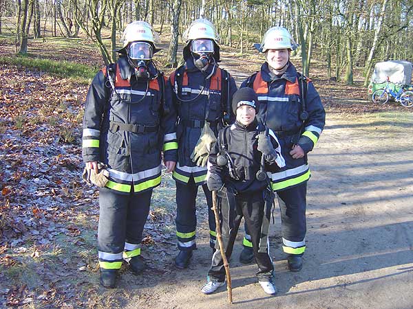 Einen nicht ganz alltäglichen Lauf absolvierten drei Kameraden der FF Fischbek. Für eine große Spende absolvierten zwei Kameraden die ca. 6 km lange Laufstrecke mit kompletter Schutzausrüstung mit PA. Der dritte Kamerad trug anfänglich zwei Ersatz-Atemschutzgeräte. Schon am Anfang des Laufes begeisterte sich der Junge Marco Sterzl für den Lauf der Feuerwehrmänner und übernahm das Tragen eines Atemschutzgerätes. Ziemlich genau in der Mitte der Strecke war der erste Satz PA-Geräte leer und so mussten neue PA-Geräte angelegt werden. Nach ca. einer Stunde kamen die drei Kameraden sichtlich erleichtert im Ziel an.