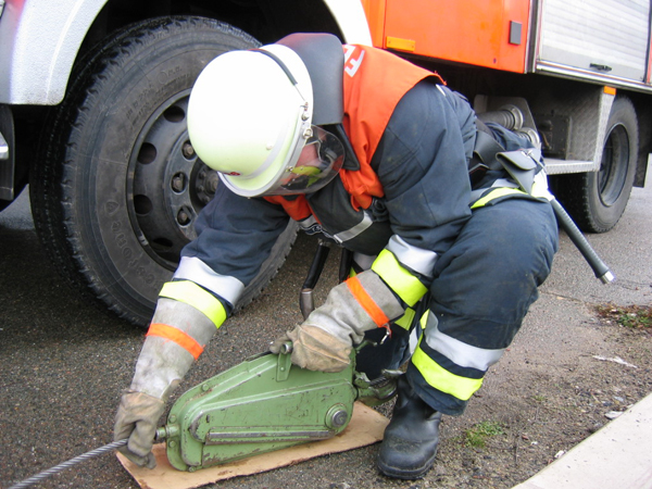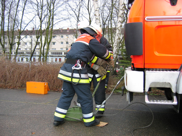 Alles halb so schlimm. Nach der Sani-Station ist sowieso alles im Kasten. Bewußtlose Person hieß es hier und es mußte schnell gehandelt werden. „Kein Problem, bei solch guten Ausbildern….“ Alle mit Bestnote bestanden. Und der Prüfungsteil am Gerät? 3-teilige Steckleiter aufbauen, sichern, A-B-C einbinden, OK perfekt, Rückbau, nächster…. Was, so schnell??? Da staunte man nicht schlecht, genauso wie beim Arbeiten mit dem Greifzug. Alles gut gelaufen.