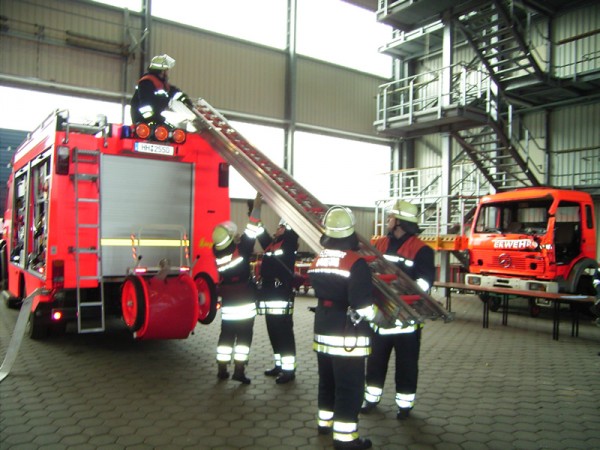 Feuer im 3. Obergeschoss lautete die erste Meldung. Die Aufgabe für die Teilnehmer bestand darin, die 3-teilige Schiebeleiter in Stellung zu bringen. Leiter gesichert hallte es laut aus der Halle an der Landerfeuerwehrschule. Das ist das Kommando, dass die Leiter an einem Festpunkt gesichert ist und die Teilnehmer an den Stützstangen, die zur Sicherung der Leiter da sind, diese verlassen können. Jetzt wurden für die Brandbekämpfung Axt, Beleuchtung und C-Strahlrohr (auch einfach ABC genannt) fachgerecht eingebunden und nach oben gezogen. Jeder Teilnehmer musste jetzt noch die gesicherte Schiebeleiter hochsteigen sowie einen Feuerlöscher und Notfallkoffer einbinden. Die Brandschutzprüfung war geschafft!