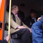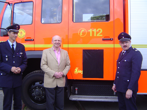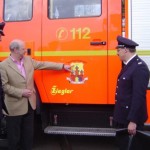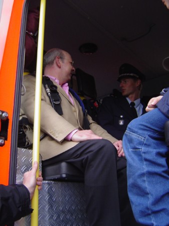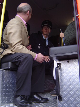 Auch hatte Herr Meinberg viele Fragen an den Wehrführer Herrn Matthias Beier, welche ihm prompt beanwortet wurden. Auch ließ Herr Meinberg es sich nicht nehmen, einmal in einem Fahrzeug der Feuerwehr Hamburg Platz zu nehmen und einmal zu testen wie man ein Atemschutzgerät anlegt.