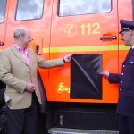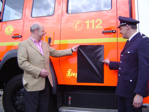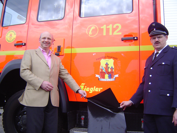 …damit die Überraschung am Samstag perfekt wird. Viele der Kamaraden waren ganz aufgeregt, denn sie hatten das Wachemblem nur von der Entstehung auf dem Papier bis zum Ausdruck auf „normalen“ Papier verfolgen können. Am Samstag Vormittag lautetet die allgemeine Frage „Warum fahrt ihr mit schwarzer Folie an den Türen durch Harburg?“ Kurz nach der Eröffnung des Binnenhafenfest wurde die Frage beantwortet. Nach Abreißen der Folie durch den Harburger Bezirksamtsleiter, Herrn Torsten Meinberg, kam das Wachemblem der Freiwilligen Feuerwehr Harburg zum Vorschein.