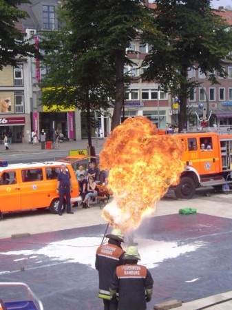 Neben einer Fahrzeugschau vom ABC-Erkunder bis zum neuen Befehlswagen gab es auf dem neuen Wandsbeker Marktplatz Spritzspiele für die Kleinen und zahlreiche Vorführungen wie Übungen der Jugendfeuerwehr, der SEG Höhenrettung und das richtige und falsche Löschen eines Fettbrandes.