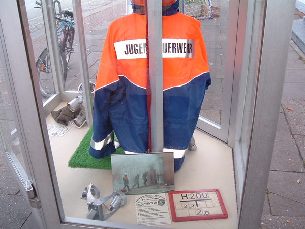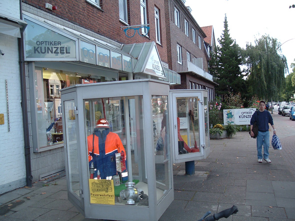 Um hierfür ordentlich Werbung zu machen, war die Firma Optiker Künzel so nett, uns zwei Schaukästen/Vitrinen zur Verfügung zu stellen. Direkt auf dem vielbefahrenen Erdkampsweg (Haupteinkaufsstrasse in Fuhlsbüttel!), vor dem Geschäft sind nun (fast) unübersehbar diverse Feuerwehrsachen ausgestellt. Sogar die Dekorierung selbst wurde von Frau Künzel vorgenommen. An dieser Stelle recht herzlichen Dank an die Firma Optiker Künzel, für diese tolle Aktion!