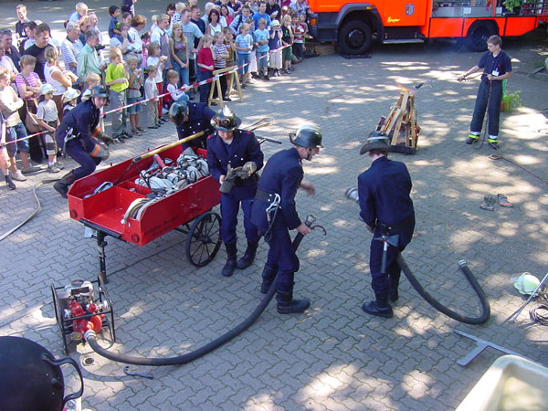 Dass die Feuerwehr auch Spaß versteht, zeigte sich bei der Löschübung mit unserem Oldtimer- Löschkarren, der eine oder andere Wassertropfen soll dabei auch versehentlich im Publikum gelandet sein.