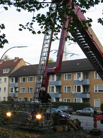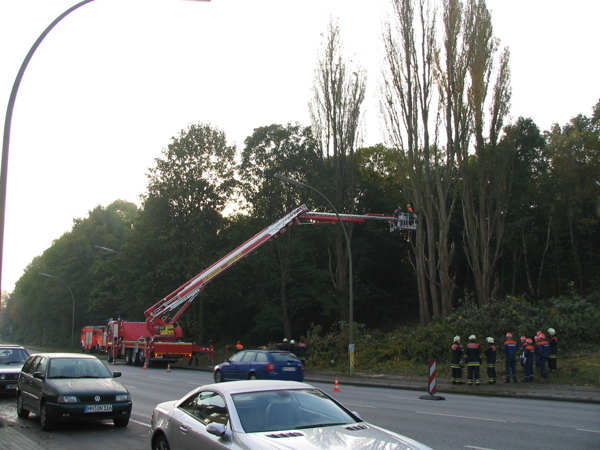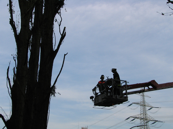 Nachdem das bestellte TMF (Teleskopmastfahrzeug TMF 53) von F-25 leider nicht bei der Fällung der Bäume erfolgreich mitwirken konnte, wurden nun in den lezten beiden Tagen die 35m hohen Pappeln Stück für Stück gekürzt. Leider fehlen hier die Informationen, wer dies durchführte. Im Vorbeifahren wurde der Wehrführer der FF-Eißendorf auf die gekürzten Bäume aufmerksam und benachrichtigte sofort den Bereichswebmaster. Aber auch am nächsten Tag wurden keine Arbeiter angetroffen, dafür aber 6m hohe Stämme.