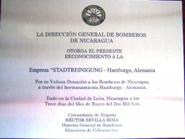 In einer beispielhaften Gemeinschaftsaktion spendete die Stadtreinigung 7 Lkw IVECO Magirus Deutz (luftgekühlt), überführten Angehörige der Freiwilligen Feuerwehr Hamburg die Fahrzeuge in einer Nachtfahrt in den Hafen von Antwerpen (Belgien), transportierte die Reederei Venbulk Service GmbH durch Vermittlung der Hamburger Reederei Rehder + Arkon diese gegen Spendenbescheinigung bis nach Caldera (Costa Rica), wo sie dann von den Bomberos aus Nicaragua abgeholt wurden. In der Werkstatt in Managua wurden die Fahrzeuge nach einer Überholung dann umgebaut.