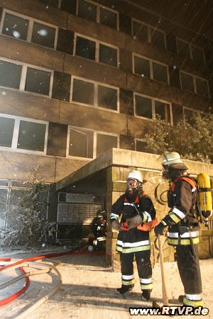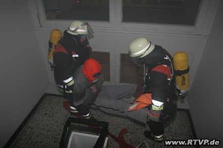 Das viergeschossige leer stehende Wohnheim war komplett mit Theaternebel verraucht, 12 Jugendliche aus der Jugendfeuerwehr Langenhorn-Nord unterstützten die Großübung als Verletztendarsteller.