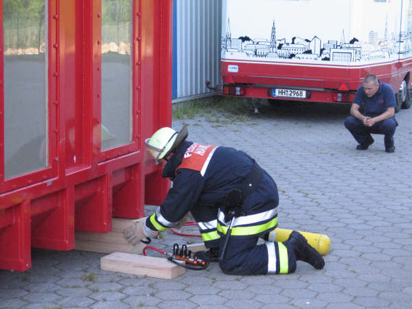 Nun ging es darum der Prüfungskommission, bestehend aus Peter Röhe (BF Marschlande) sowie Björn Fiedler (WF FF Berliner Tor) und Erhard Haack (WF FF Moorfleet), zu zeigen was sie gelernt haben.