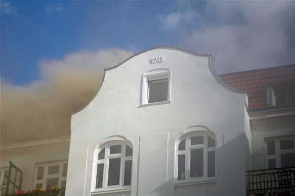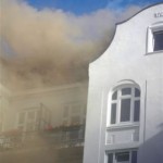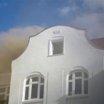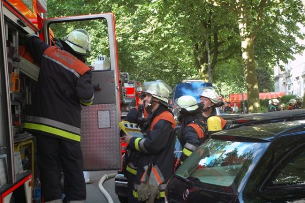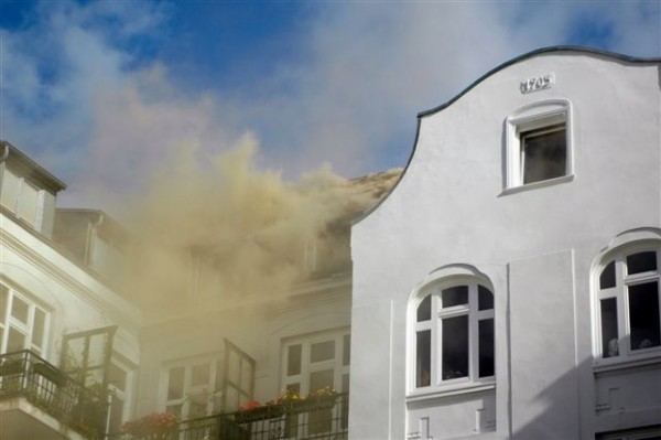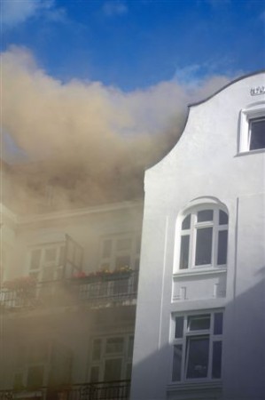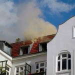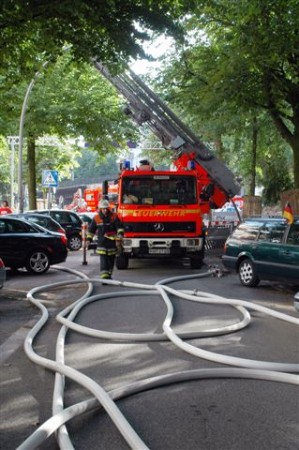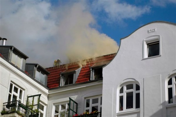 „Aus bisher ungeklärter Ursache kam es im Dachstuhl eines fünfgeschossigen Wohnhauses, mit ausgebautem Dachgeschoss, in geschlossener Bauweise, zu einem Feuer. Bei Eintreffen der ersten Einsatzkräfte brannten ca. 80m ² Dachfläche, sowie Teile der die linken Dachgeschosswohnung.