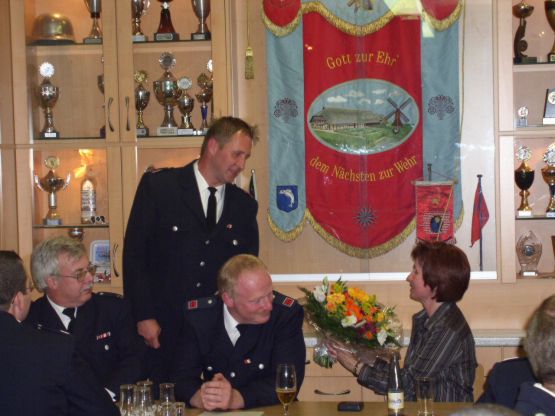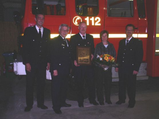 Wehrführer Wolfgang Bierkarre bedankte sich im Namen aller Warwischer Kameraden besonders für die langjährige Tätigkeit als Schirrmeister und Gerätewart, die einen hohen zusätzliche Zeitaufwand neben dem normalen Feuerwehrdienst erfordere und vom Jubilar mit viel Engagement und Verantwortungsbewusstsein ausgefüllt werde. Zur Erinnerung an das Jubiläum überreichte der Wehrführer ein Kupferbild mit Wehremblem und Uhr. Mit gleich mehreren Blumensträußen bedankte sich die Wehr und die Gruppe 2, in der Guido Bestier Dienst tut, für die Unterstützung und das Verständnis für das Ehrenamt bei der Ehefrau des Jubilars, Kirsten Bestier.