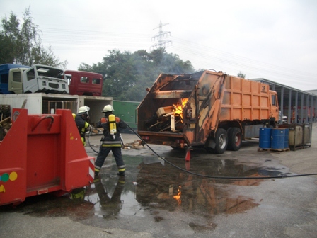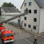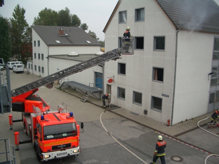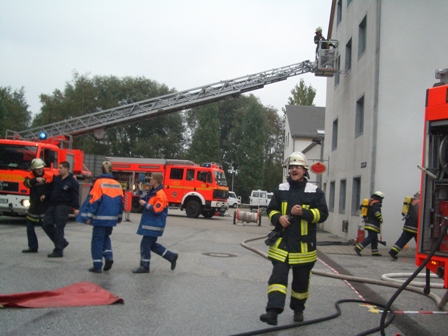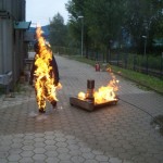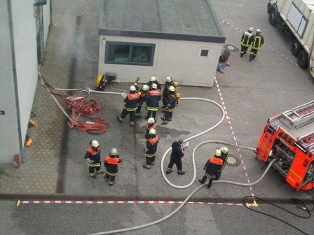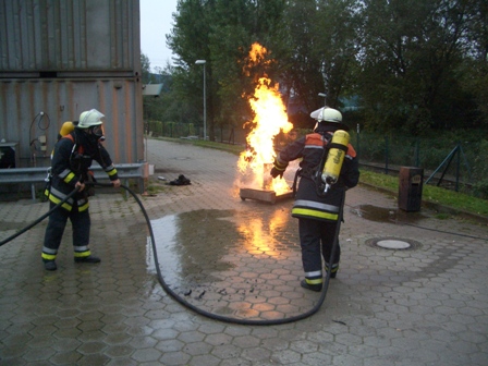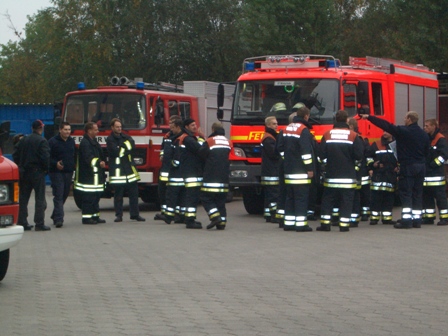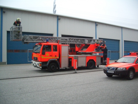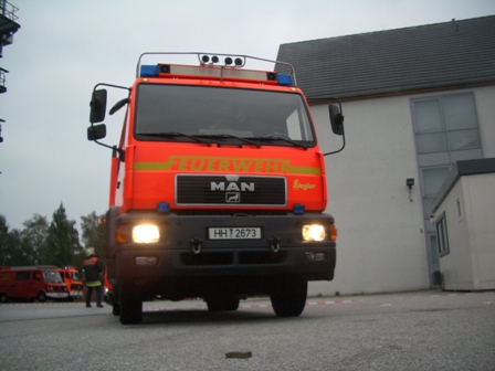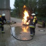 Auf einen besonderen Einsatz möchten wir hier doch noch einmal eingehen: Die Freiwillige Feuerwehr Ahrensburg wurde zu einem „Feuer klein“ (FEUK) gerufen. Am Einsatzort stellte der Fahrzeugführer fest, dass irgendeine Flüssigkeit in Brand geraten war. (Hierzu wurde die Brandsimulationsanlage der Firma brandmauer-nord benutzt – Vielen Dank!) Als der Angriffstrupp den Befehl bekam den Flüssigkeitsbrand zu löschen, kam es zu einem schrecklichen Szenario: Plötzlich sprang aus diesem Feuerball eine Person, die sofort Feuer fing. Um die Einsatzkräfte weiter zu belasten, wurde während des Löschvorgangs der Person eine Spraydosenexplosion durchgeführt. Die gesamte Situation wurde vom Löschfahrzeug der FF Ahrensburg erfolgreich beendet.