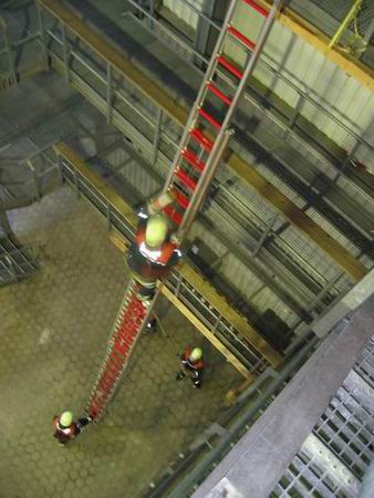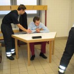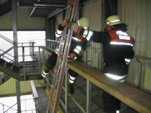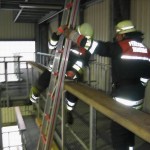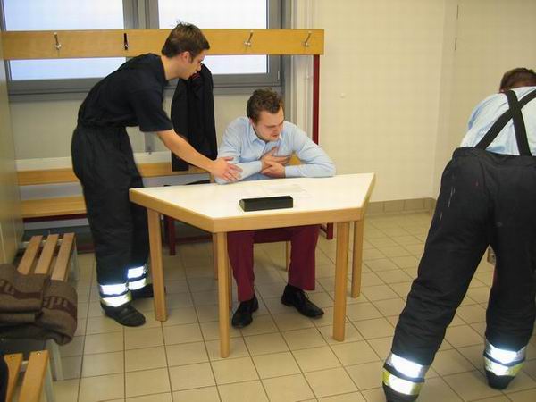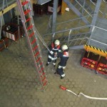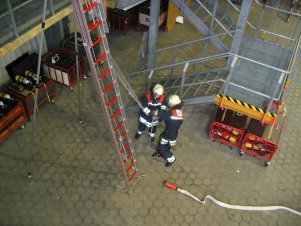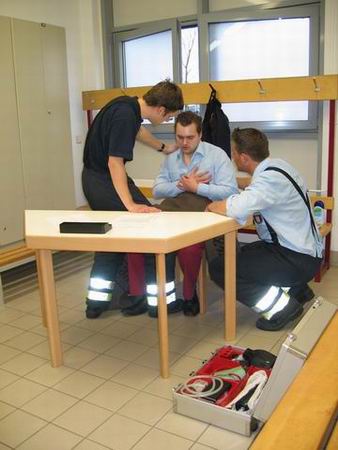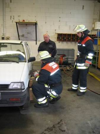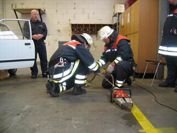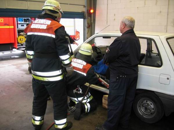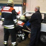 Bei der Ersten Hilfe erwartete die Prüflinge eine Person, die einen Herzinfarkt erlitten hatte. Bei der durchzuführenden Erstversorgung kam es in erster Linie darauf an, den Patienten trotz vorhandener schockähnlicher Symptome nicht in die Schocklage zu verbringen. Daneben galt es aber auch, für Frischluftzufuhr zu sorgen, die Vitalwerte zu kontrollieren, eine richtige Rückmeldung abzugeben sowie eine angemessene Betreuung durchzuführen. Im Rahmen der Technischen Hilfeleistung musste an einem PKW angedeutet werden, wie ein Vorgehen nach einem Verkehrsunfall mit einer eingeklemmten Person mittels der hydraulischen Rettungsgerät vom LF 16/12 aussehen könnte. Darüber hinaus waren die Hydraulikgeräte im Hinblick auf Funktion und Eigenschaften zu erklären. Im Bereich des Brandschutzes war schließlich gemeinsam von zwei Trupps die dreiteilige Schiebleiter aufzustellen und im 3. OG ein C-Rohr vom Angriffstrupp vorzunehmen. Abgeschlossen wurde diese Übung damit, dass jeweils einmal ein Notfallkoffer und ein Feuerlöscher einzubinden waren. Nach ca. zwei Stunden hatten alle Trupps die drei Stationen erfolgreich durchlaufen, so dass