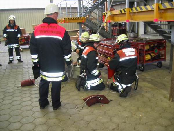 Nachdem man im Vorjahr den ersten Teil bereits erfolgreich hinter sich gebracht hatte, wurde die endgültige Abnahmeprüfung jetzt vor einer Prüfungskommission aus Berufsfeuerwehr und Freiwilliger Feuerwehr abgelegt. Aus diesem Grund waren an diesem Tag neben dem fünf Anwärter fassenden Lehrgang des Bereiches Walddörfer noch der Grundausbildungslehrgang aus dem Bereich Harburg mit sieben Teilnehmern an der LFS erschienen. Nach der Begrüßung durch die Prüfer um 08:00 Uhr wurde mit einem zwanzig Fragen umfassenden Test begonnen, welcher von allen Teilnehmern erfolgreich abgeschlossen wurde. Danach folgte die Aufteilung in Trupps, um anschließend die drei Stationen in den Bereichen Erste Hilfe, Technische Hilfeleistung und Brandschutz abzuarbeiten.