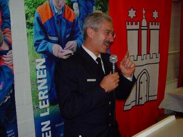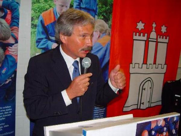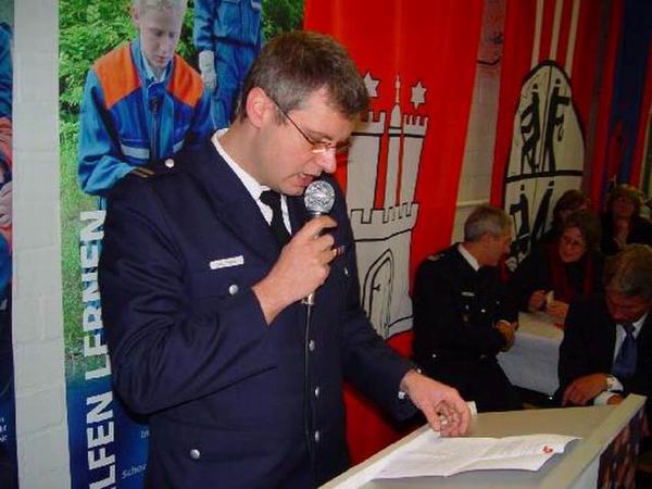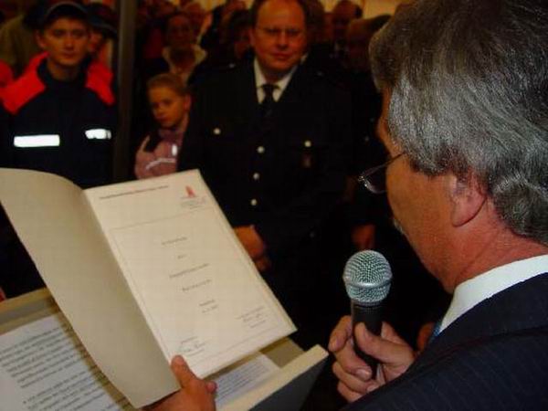Eröffnet wurde die Veranstaltung von Thomsen Stern, Wehrführer der FF Duvenstedt, der den Ablauf bis zur Gründung der JF Duvenstedt aufzeigte. Anschließend übergab er das Mikrofon an Hamburgs Innensenator Udo Nagel, der das Engagement des Jugendfeuerwehrwartes Olaf Krohn und seinem Vertreter Jörg Christ und die hinter ihnen stehende Wehr sehr lobte. Er hob insbesondere hervor, was für einen wichtigen Teil die JF in der Jugendarbeit einnehme. „Mit der Jugendfeuerwehr habt Ihr Euch eine sinnvolle und lehrreiche Freizeitbeschäftigung ausgesucht!“, sagte er zu den Jugendlichen und bat anschließend, langfristig mit so viel Begeisterung Mitglied der JF zu sein und allen Freunden und Bekannten zu erzählen, wie toll es dort sei, damit später einmal noch mehr dazukämen. Dann überreichte Herr Nagel die Gründungsurkunde dem Wehrführer, welcher diese gleich an den Jugendfeuerwehrwart Olaf Krohn weiterreichte.