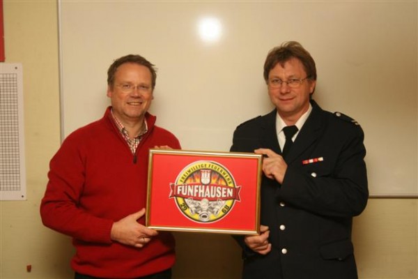 Da die aktiven Kameraden der FF Fünfhausen alle nicht die künstlerische Ader haben, wurde das Wappen durch einen Kameraden der Ehrenabteilung entworfen und produziert. Am Dienstag den 21.11.2006 wurde dieses Wappen dann vom Ehrenabteilungskameraden Kay Tofern, der eine Werbegestaltungsfirma besitzt, an den Wehrführer Hugo Jahn in einem feierlichen Akt übergeben.