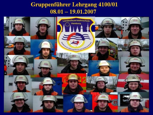 Nach zwei Wochen intensiver Ausbildung an der Landesfeuerwehrschule haben am Freitag dem 19.01.07 25 Feuerwehrangehörige der FF Hamburg und ein Feuerwehrangehöriger der WF Messe Düsseldorf die Prüfung zum Gruppenführer bestanden und blicken nun neuen Herausforderungen im Einsatzgeschehen entgegen.