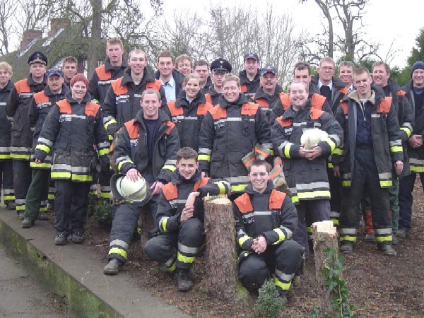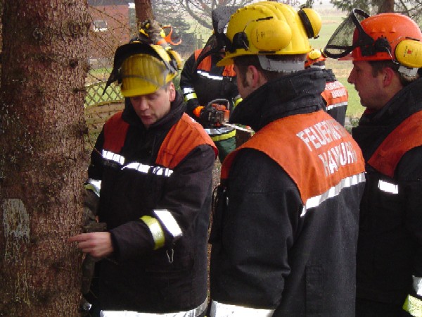 Pünktlich um 7:45 Uhr hatten sich 27 Kameradinnen und Kameraden am Ochsenwerder Elbdeich 31 versammelt. Den Fichten standen 19 Teilnehmer und acht Ausbildern gegenüber, die ihreFertigkeiten im Umgang mit der Motorsäge vertiefen wollten. „Achtung! Baum fällt!“ klang es immer wieder durch den trüben Februar Morgen.