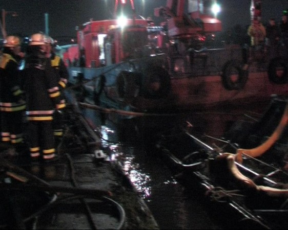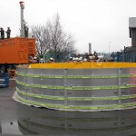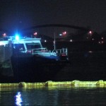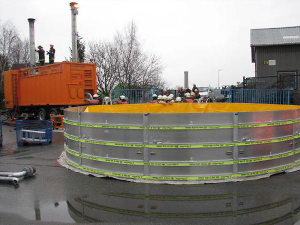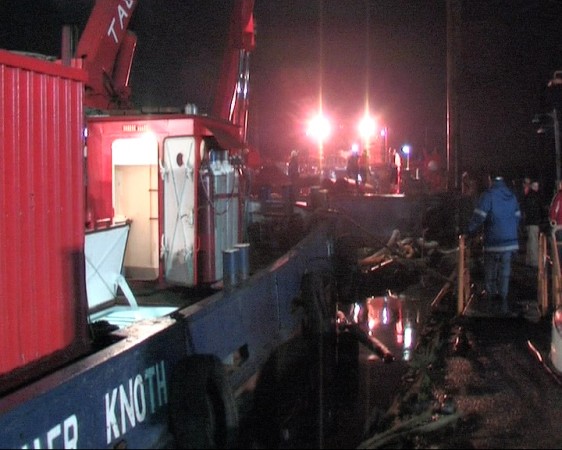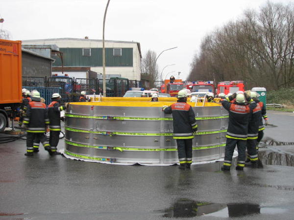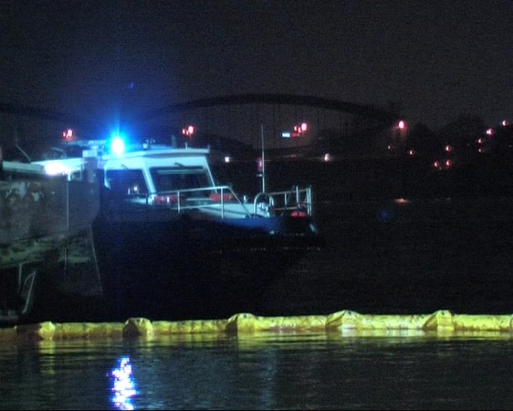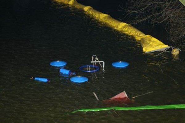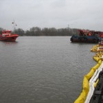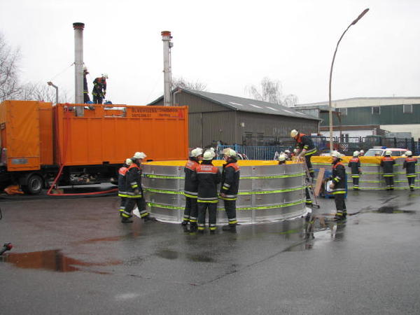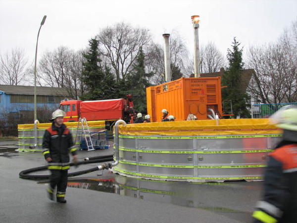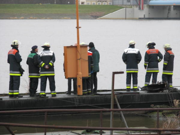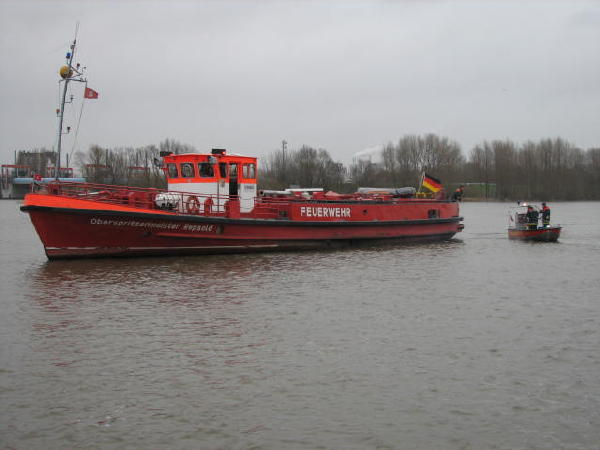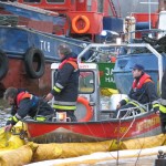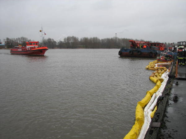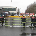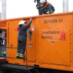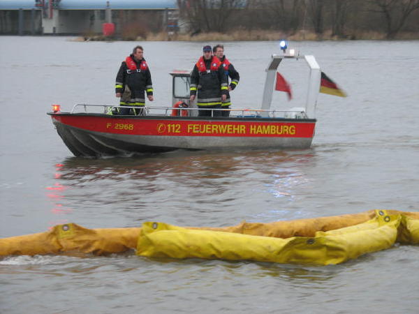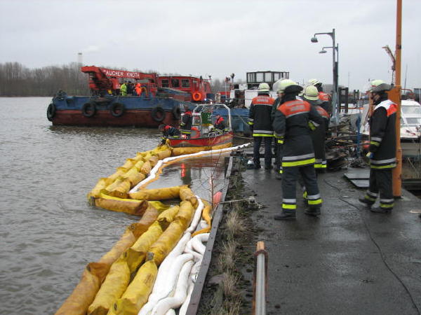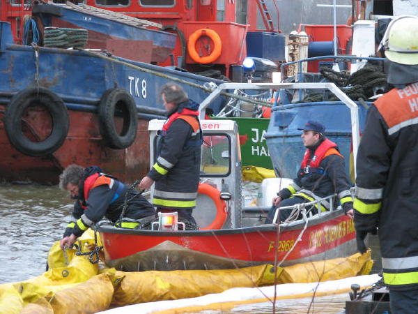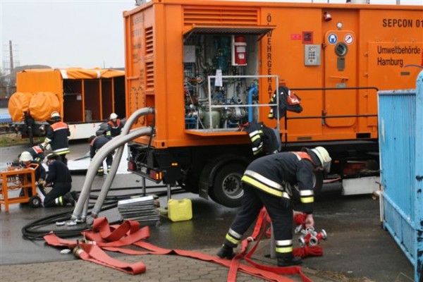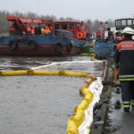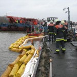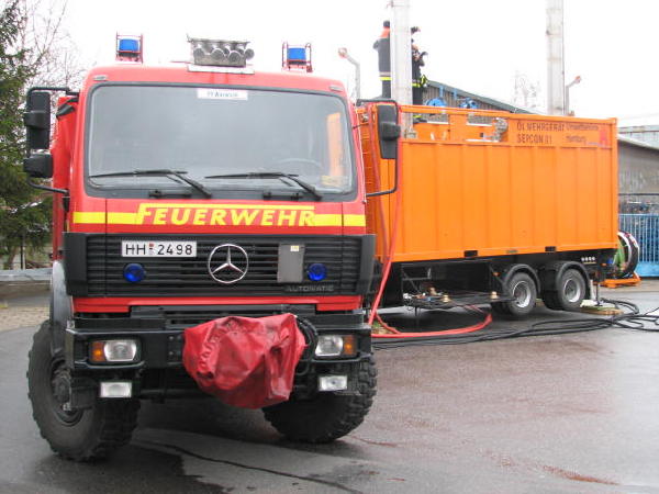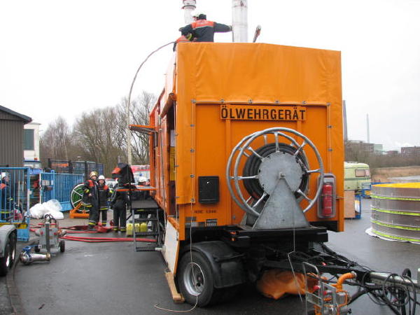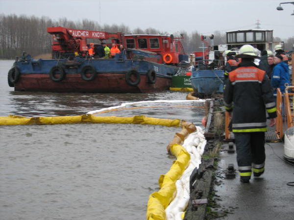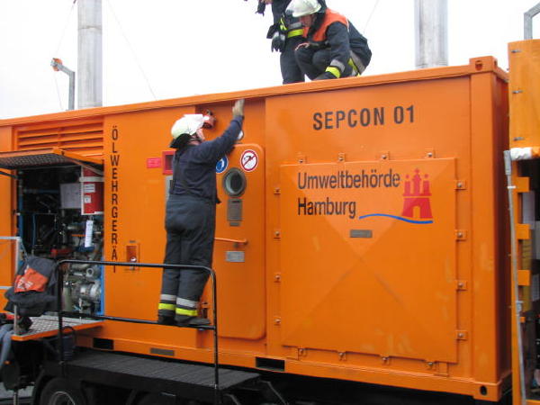 Dies führte nach Beratung des B- und des U-Dienstes mit der Umweltbehörde zu einem bisher noch nicht dagewesenen Einsatz. Die sog. SEPCON-Anlage, betrieben von den FFen Warwisch und Fünfhausen, wird aufgebaut und soll zum Einsatz kommen, um Öl-Wasser-Gemisch aufzunehmen und zu separieren. Immerhin hat das gesunkene Schiff ca. 4.000 l Heizöl in seinen Tanks. Im Erstangriff wurden vom LAB 11 und den KLB 33 Ölschlängel ausgebracht.