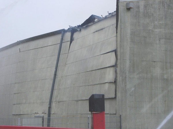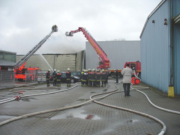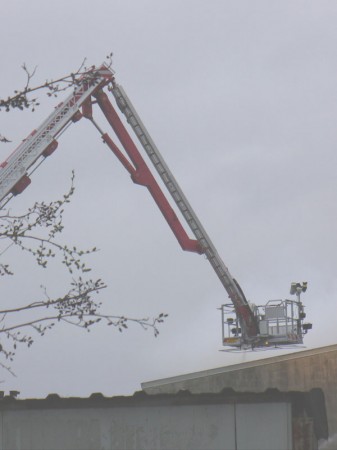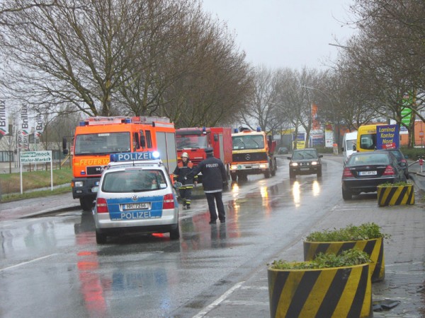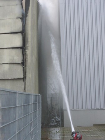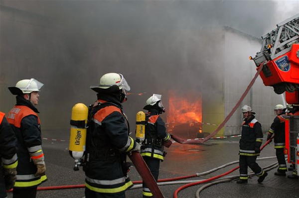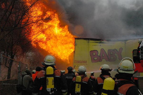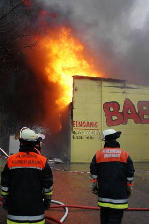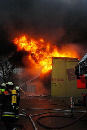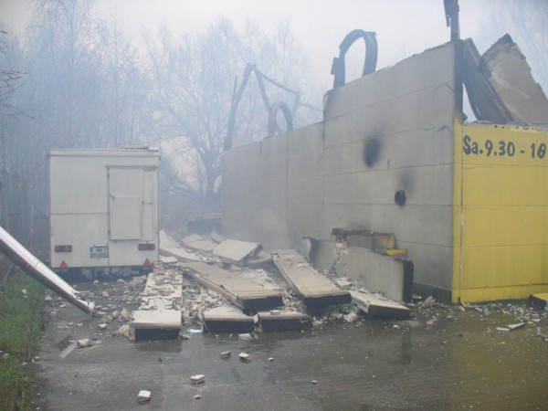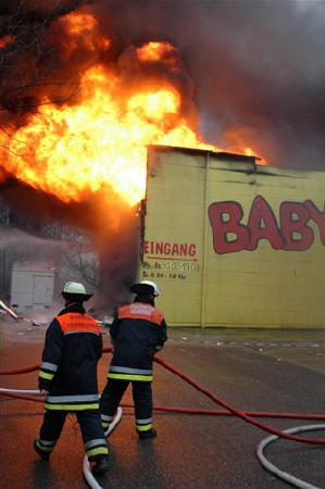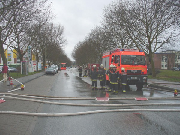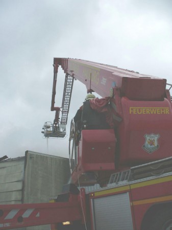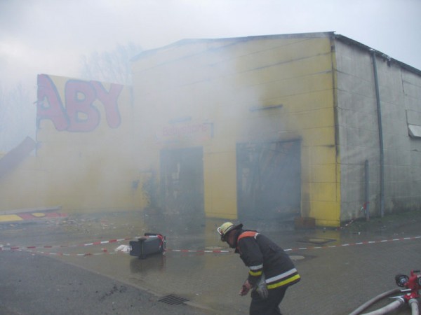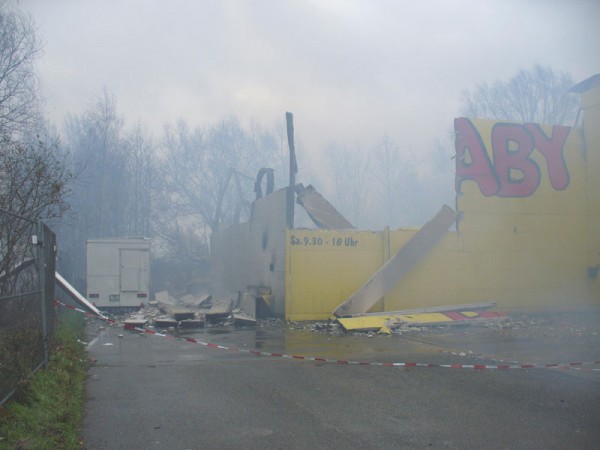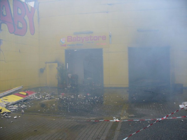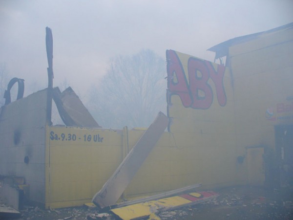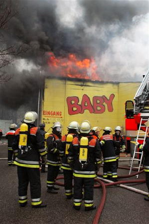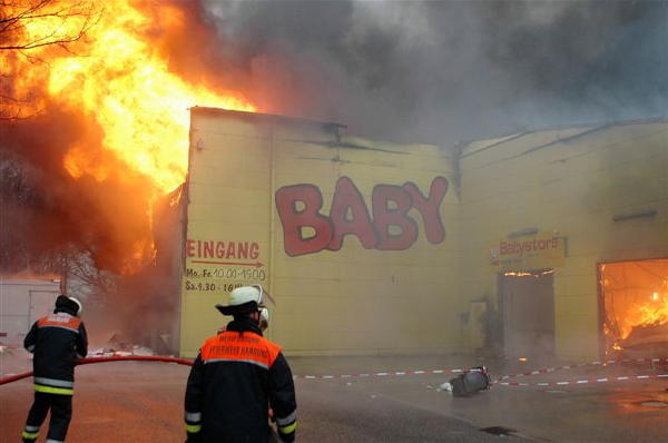 Das ca. 15x30m große ebenerdige Objekt beherbergt einen Babyfachmarkt. Zunächst wurden im Innenangriff 2C-Rohre unter PA vorgenommen, diese mussten aber zurückgenommen werden nachdem es zur Durchzündung kam. Der entstandene Vollbrand musste dann wegen Einsturzgefahr von Hallendach und -wänden im Außenangriff mit 3C- und 4B-Rohren (davon 2 über DLK) sowie 3 Wasserwerfern bekämpft werden. Zusätzlich ist der große Teleskopmast der FuRW 25 im Einsatz.