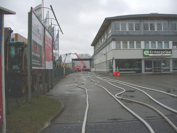 Die benachbarten Gebäude, ein Lagerhallenkomplex, mussten massiv gekühlt werden. Wegen der starken Rauchentwicklung in Richtung der BAB A 1 wurde in den 9h-Nachrichten eine Rundfunkdurchsage ausgestrahlt.