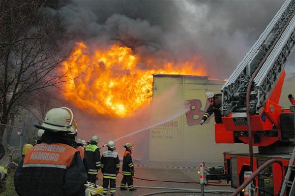 Brennt hallenartiges Ladengeschäft in Harburg in ganzer Ausdehnung. 4 FF und 3 HLZ seit 08.04 h im Einsatz.