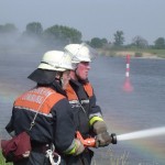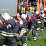 Bei strahlendem Sonnenschein begann die Abnahme mit einer Brandstellenübung am Kraueler Elbufer. Mit „Wasserentnahme: offenes Gewässer…“ begann der Einatzbefehl von Ausbilder Jörn Heitmann . „Vier Sauglängen!“, erklang wenig später das Kommando von Wassertruppführer Marc-Simon Pahl. Der Löschangriff entwickelte sich und nach noch wenigen Minuten hatten alle drei C-Strahlrohre Wasser vor. Mit Schnelligkeit und klaren Kommandos konnte so der Prüfungsauftakt erfolgreich gestaltet werden.