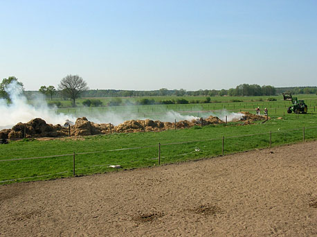 In dieser Situation zeigten alle Sülldorfer Bauern, wie zu erwarten, große Hilfsbereitschaft und halfen dabei, die großen Strohballen mit Treckern aus der Halle zu bekommen. Auch das THW Altona unterstützte mit einem Radlader. Stroh zeigt in solchen Lagen große Nachteile in der Brandbekämpfung, denn das Löschwasser sickert nur bedingt ins Innere eines Strohballens und damit zum Glutnest. So mussten die Ballen auf das nächste Feld transportiert werden, um dann in mühevoller Kleinstarbeit abgelöscht zu werden.