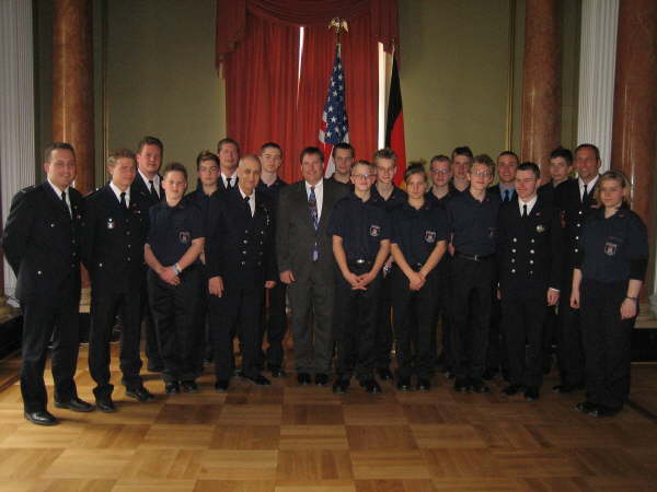 Für die US-amerikanischen Gäste und die Mitglieder der FF und JF Stellingen gab es in der Woche eine Menge zu erleben: Neben dem herzlichen Empfang durch die Jugendfeuerwehr am Flughafen, Besichtigung der Landesfeuerwehrschule, des Containerhafens der HHLA, Besuch des Bundesligaspiels HSV vs. Mainz 05, einem gemeinsamen Präsentationsabend mit Gästen und Eltern u.v.m. stand unter anderem auch ein Empfang beim Generalkonsul der Vereinigten Staaten Duane C. Butcher auf dem Programm: