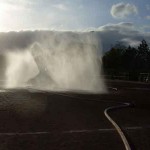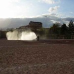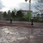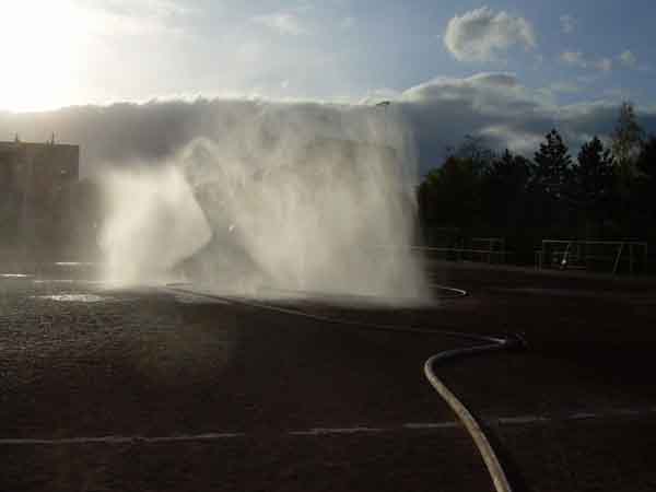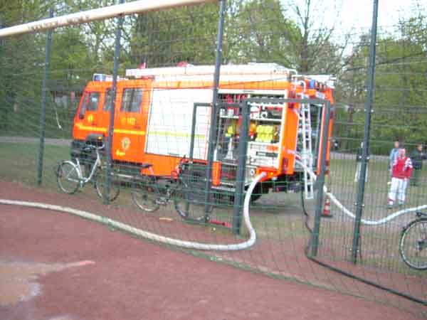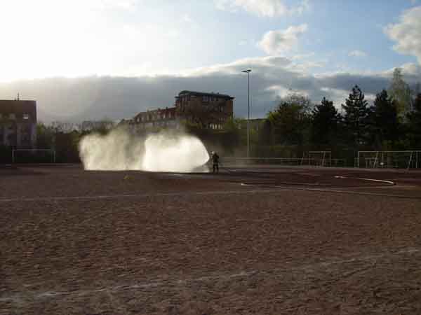 12 Feuerwehrmänner und -frauen gingen mit insgesamt 5 Rohren vor und nach einer Stunde konnte das angesetzte Punktspiel doch noch angepfiffen werden. Die Bewässerung der Feuerwehr reichte auch noch für die Einhaltung der erforderlichen Feinstaubwerte am nächsten Tage aus, so daß auch das Jugend-Turnier problemlos stattfinden konnte.
