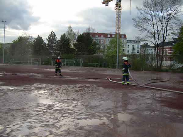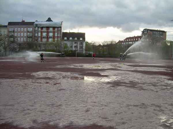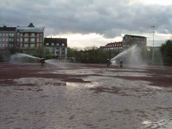 Am Abend war ein Punktspiel der Frauenmannschaft des FC Sternschanze angesetzt und für das Wochenende ein Jugend-Fußballturnier geplant. Das Umweltamt bat kurzerhand um Amtshilfe und die Freiwillige Feuerwehr (FF) Pöseldorf schritt sofort ein. Um 18 Uhr rückten die 2 Löschfahrzeuge der FF an, die Feuerwehrleute bauten sofort eine Wasserversorgung auf und los ging es mit dem Wässern des Sportplatzes.