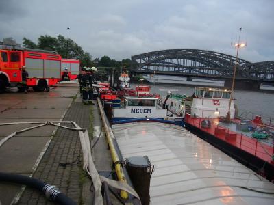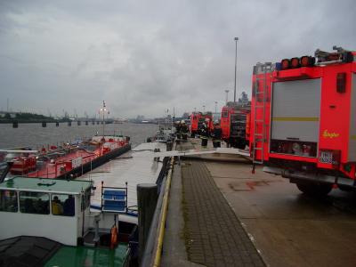 Seit 15:15 Uhr war der Löschzug der Feuer- und Rettungswache Wilhelmsburg (F34) damit beschäftigt, das allmähliche Sinken eines Schüttgut-Frachters, welcher Erz geladen hatte, zu verhindern.