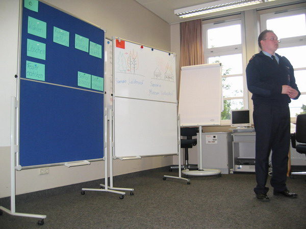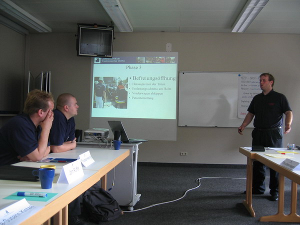 Jedoch war es letztendlich die zweite Woche, in der ausschließlich Lehrproben für die Lehrgangsteilnehmer auf dem Plan standen. So hatte am Montag und Dienstag jeder die Möglichkeit, eine praktische Lehreinheit auf dem Übungsgelände abzuhalten. Am Mittwoch galt es dann, einen zehnminütigen Lehrvortrag zu einem Thema freier Wahl zu halten. Die letzten beiden Tage wurden dazu genutzt, dass alle einmal ein Lehrgespräch mit der Gruppe zu einem bestimmten feuerwehrbezogenen Stoff führen durften.