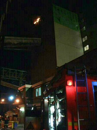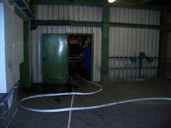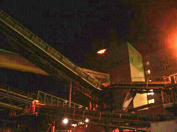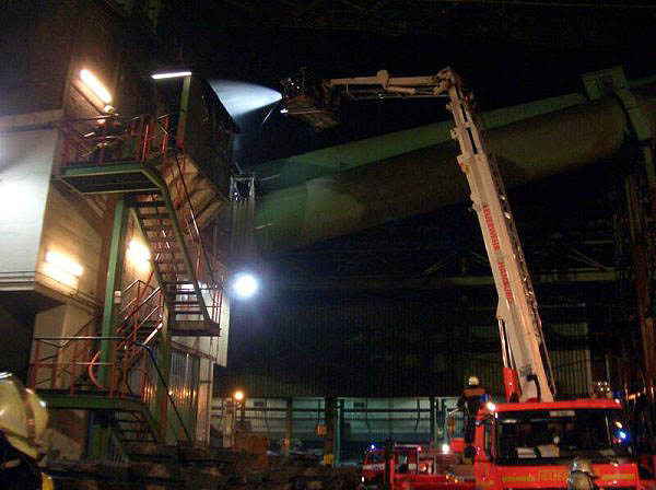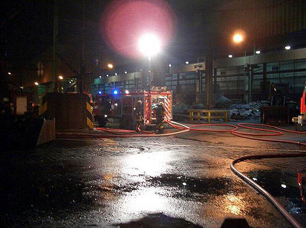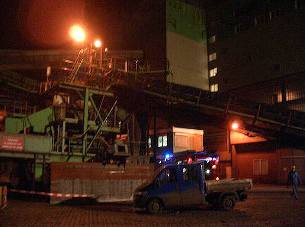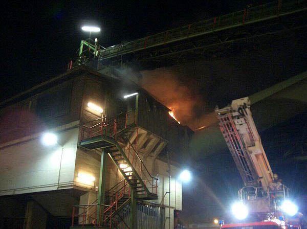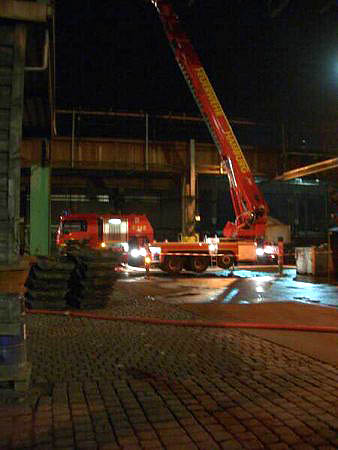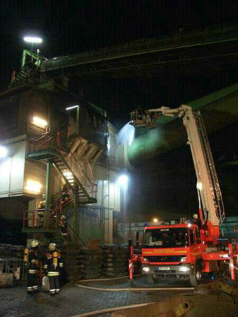 Zwischen zwei Produktionsgebäuden, einer davon ein Siloturm, geriet ein Förderband auf ca. 50m Länge in 20m Höhe in Brand. Das Förderband verlief zwischen den Gebäuden, sodaß sich Feuer und Rauch in beide Gebäudeteile ausbreiteten. Aufgrund der Anrufe wurde frühzeitig FEU2 ausgelöst, was kurze Zeit nach Eintreffen der ersten Kräfte vom B-Dienst auf FEU4 erhöht wurde.
