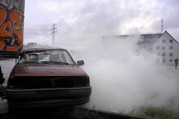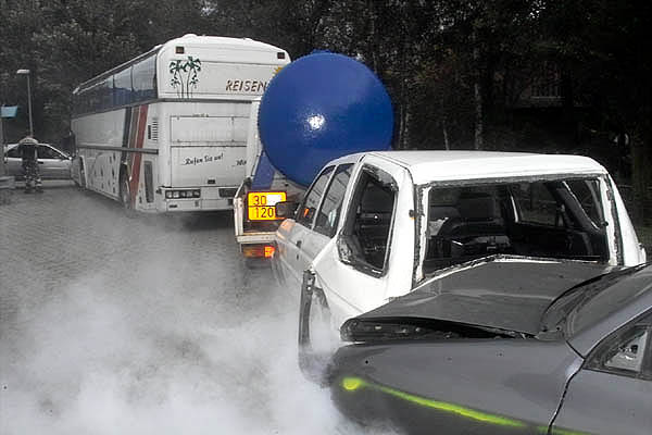 Die dritte Übungslage befasste sich mit einem Gefahrguttransporter, welcher auf einen vollbesetzten Reisebus aufgefahren war. Auf den Gefahrgutlaster fuhren dann noch 3 weitere Pkw auf. Aus dem Tank des LKW floß eine gefährliche Flüssigkeit, breitete sich in der Einsatzstelle aus und bedrohte die Insassen des Busses, das eingestzte Rettungspersonal und das öffentliche Sielnetz.