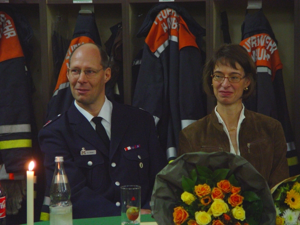 Wehrführer Stefan Benzinger hob den Werdegang des Jubilars hervor und lobte hierbei seine Verdienste in der Wehr, sowie seine Aufgabe in der Jugendarbeit der Jugendfeuerwehr. Nach dem Überreichen des Jubiläumsgeschenks erhielt die Ehefrau des Jubilars Marion von Thienen einen Blumenstrauß als kleine Entschädigung dafür, dass sie ihren Mann besonders häufig mit der Feuerwehr teilen müsse.